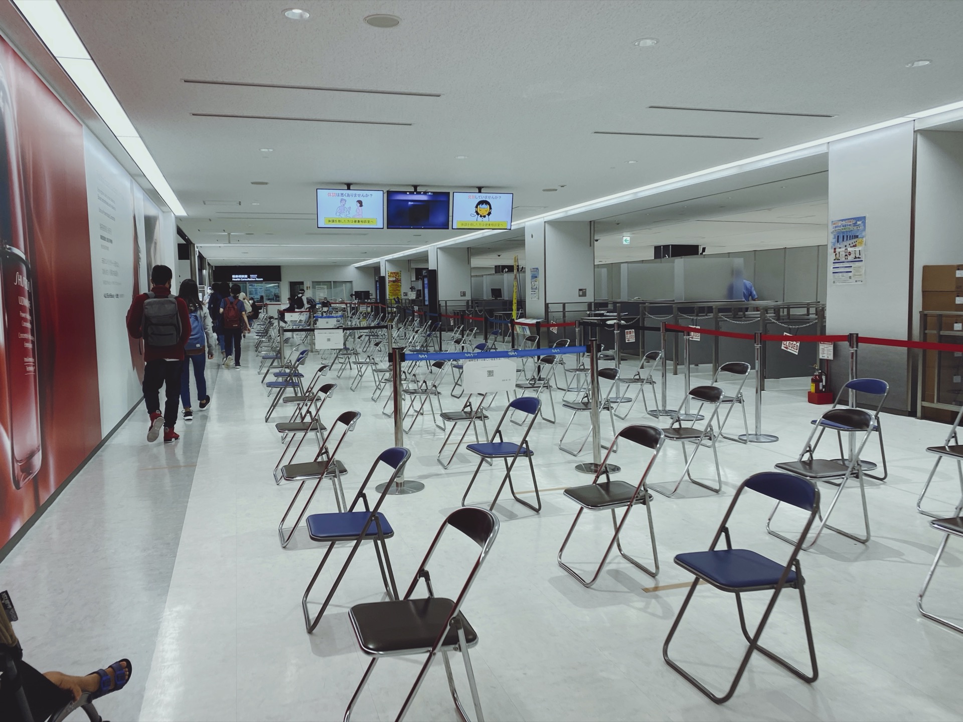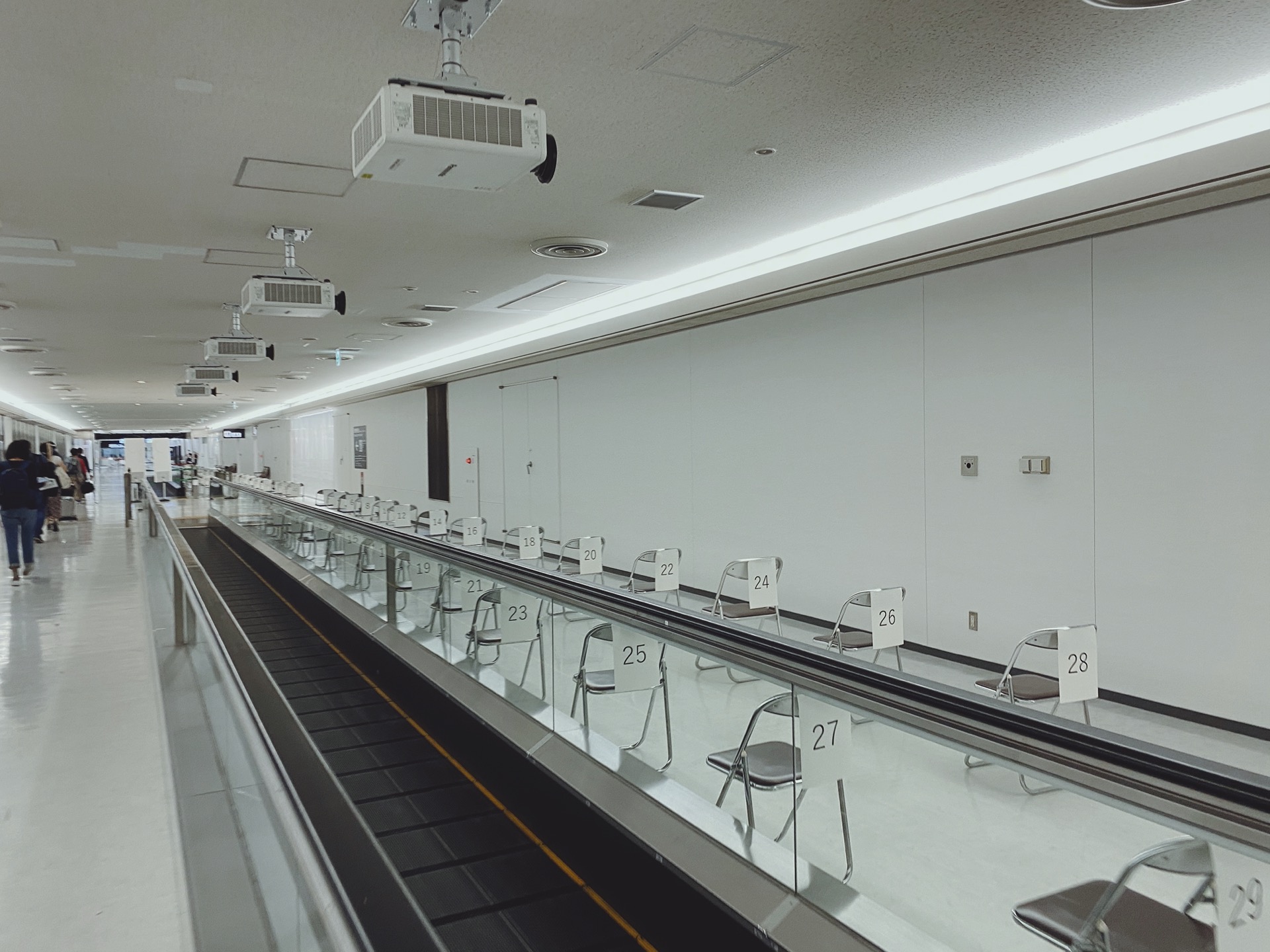 到着便が重なった時や乗客が多い時は検査受付まで、このイスで待つようです。