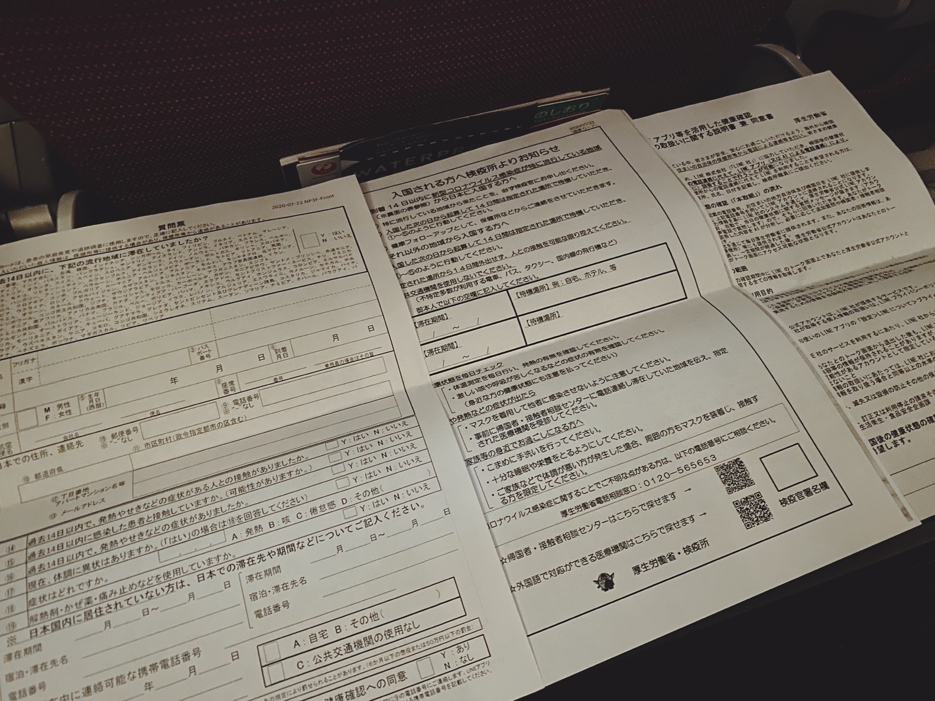 機体が安定すると、コロナに関して記入しておく書類についてチェックインの際に受け取ったか確認がありましたが、私たちは何も受け取っていませんでした。