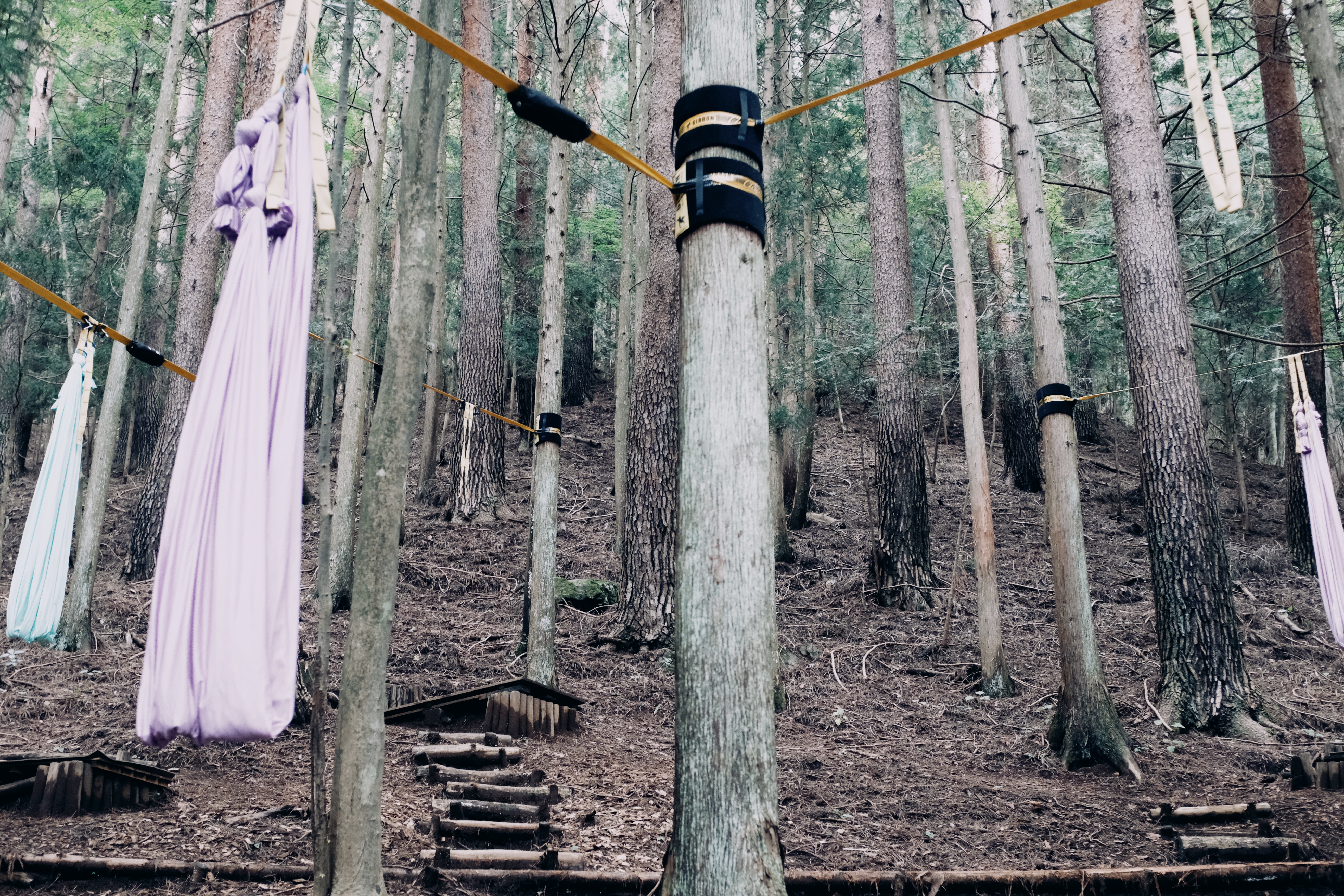 朝食が終わると、夫とJ君はクラウドテラスに散策に、私は昨日のチェックインの際に予約した“エアリアルヨガ”を体験しに森に向かいます。