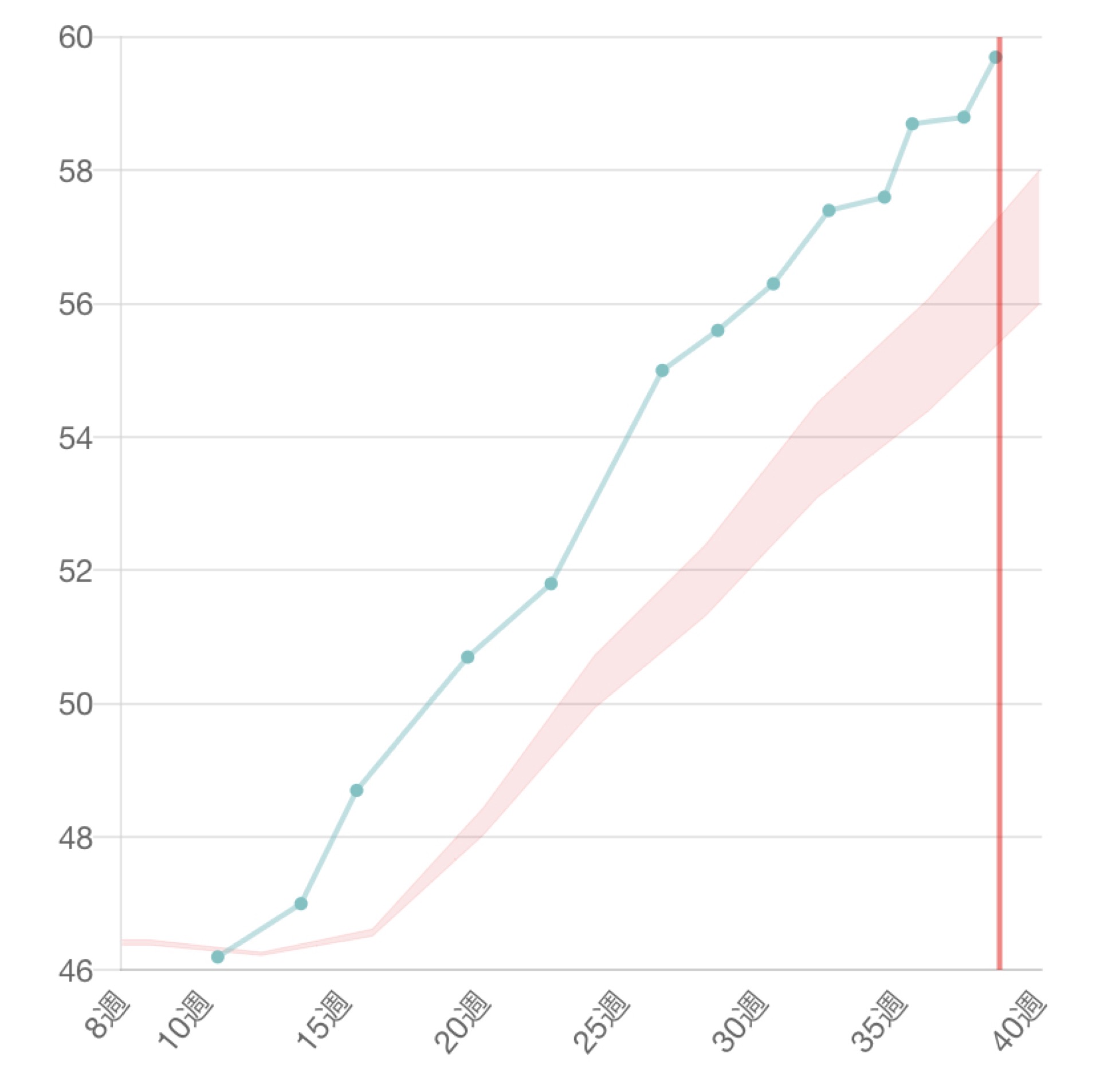 ピンクの枠内が理想の体重増加幅なのですが、初期から枠を飛び越え最後の検診39wではほぼ60kg。